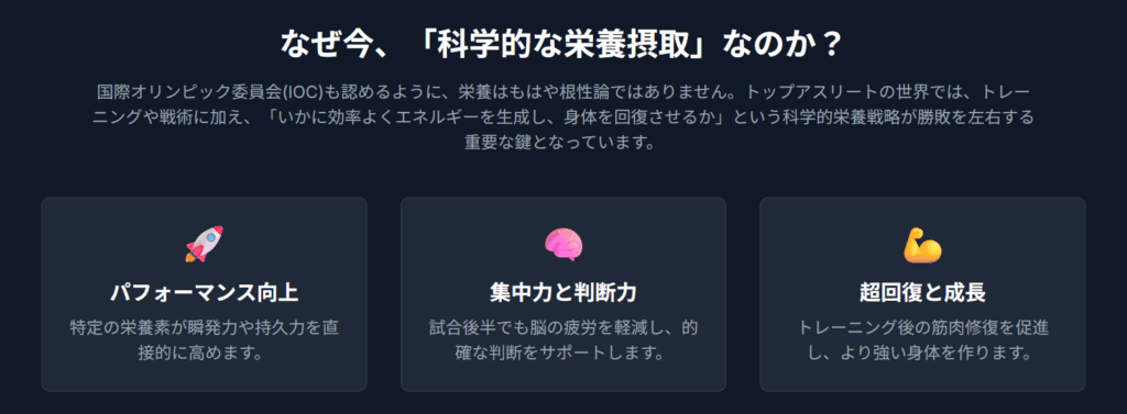 最新のテクノロジーを駆使した論文は、どの栄養素が、どのように身体に作用し、パフォーマンスを向上させるのかを次々と明らかにしています。これは、一部のトップ選手だけのものではありません。正しい知識を持てば、高校生や大学生、そしてすべてのスポーツ愛好家が、その恩恵を受けることができる時代なのです。