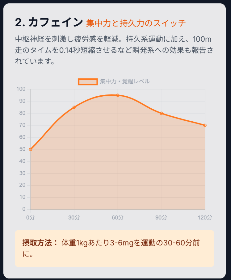 - ポイント:カフェインのように即効性はなく、数週間にわたって継続摂取することで、筋肉内のカルノシン濃度を高める「ローディング」が必要です。