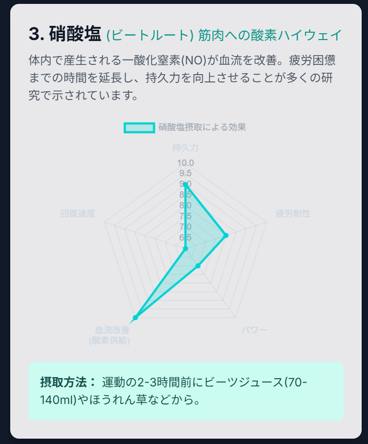 3. 硝酸塩(ビートルートジュース):「筋肉への酸素ハイウェイ」