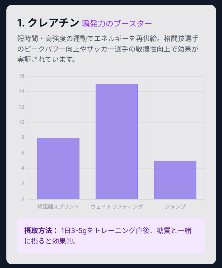 - 具体例:トレーニング直後に飲むプロテインシェイクに、クレアチンパウダーを3〜5g混ぜて飲む。