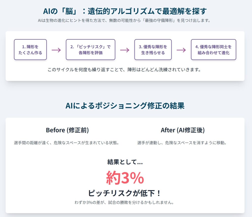 - 「遺伝的アルゴリズム」は、これと似ています。コンピューターの中で、たくさんの「立ち位置のパターン」をランダムに作ります。そして、それぞれのパターンが「どれくらいピッチリスクを減らせるか」を評価します。良いパターンは生き残り、悪いパターンは消えて、生き残った良いパターン同士を組み合わせて、さらに新しいパターン(より良い立ち位置)を生み出していくのです。これを何度も繰り返すことで、最終的に「失点リスクが一番少ない、チーム全員の立ち位置」を見つけ出すことができます。