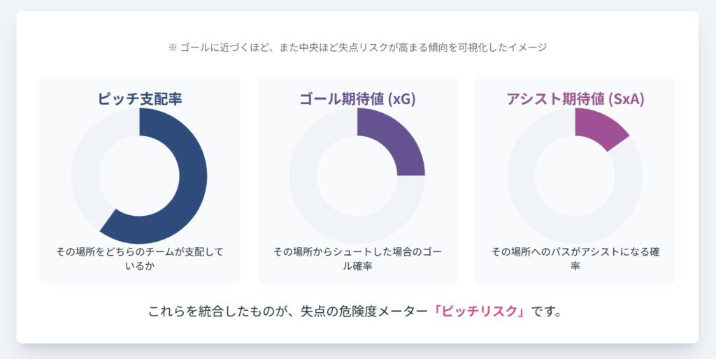 - 「Pitch Risk(ピッチリスク)」という、ピッチの支配状況、ゴールの確率、アシストの確率を組み合わせて失点のリスクを数値化する新しい評価方法を開発。