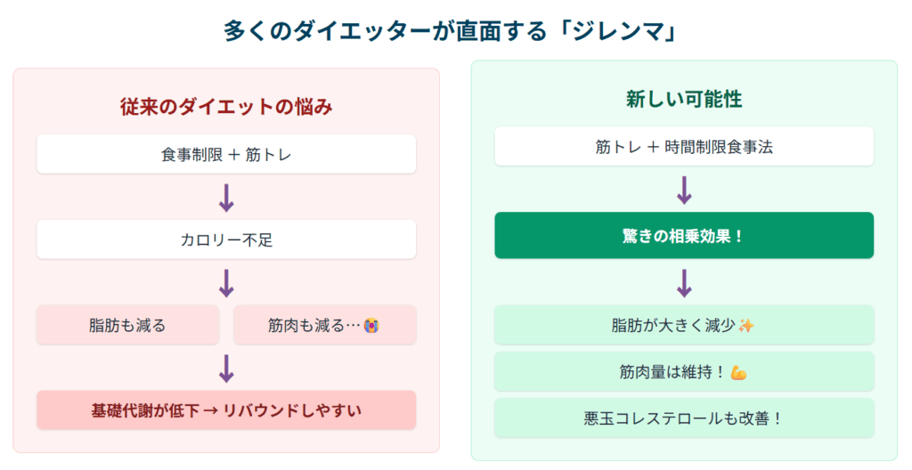 従来の食事制限では、体はエネルギー不足を補うために、脂肪だけでなく筋肉も分解してしまいがちでした。筋肉が減ると基礎代謝が落ちるため、かえって痩せにくく、リバウンドしやすい体になってしまうという悪循環がありました。
