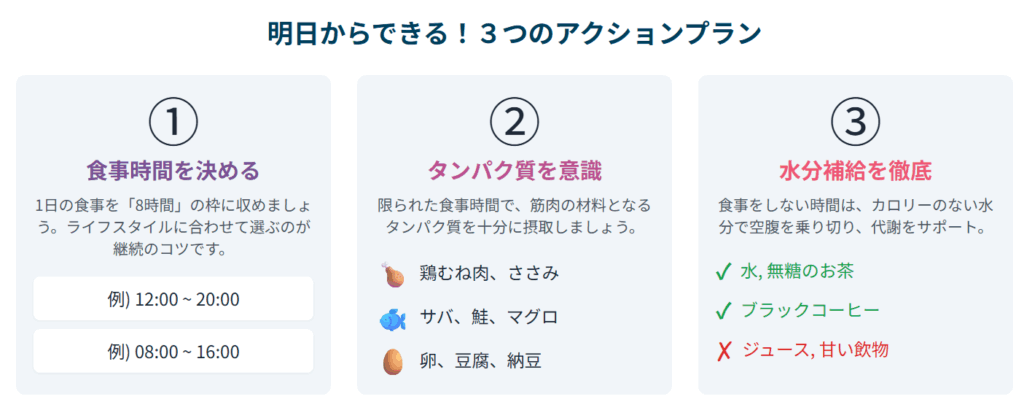 まずは、1日の中で食事をして良い「8時間」を決めましょう。あなたの生活スタイルに合わせて、無理のない時間帯を設定することが継続のコツです。
