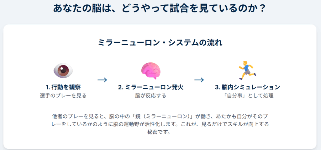 • 脳の活性化: 他者の行動を観察することが、運動をつかさどる脳の領域を活性化させることが確認されました。これは、観戦が単なる学習ではなく、脳を鍛えるトレーニングであることを意味します。