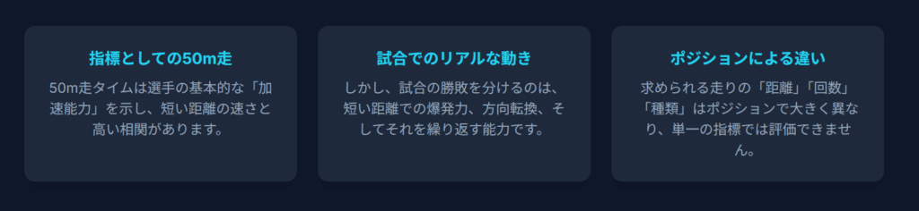 今回の複数の研究を総合すると、50m走の記録は、選手の基本的な加速ポテンシャルを示す一つの指標としては意味がありますが、サッカーの試合における「走力」の全てを測るものではないことが明らかになりました。サッカーで本当に求められるのは、短い距離での爆発的な加速、それを繰り返す能力、そして方向転換を伴う複雑なスプリントです。