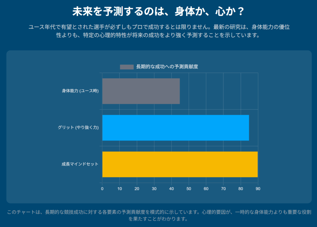 - 結果: ユース年代での一時的な身体能力の優位性よりも、グリット(Grit)や成長マインドセット(Growth Mindset)といった心理的特性の方が、将来トップアスリートとして成功するかどうかをより強く予測していた。